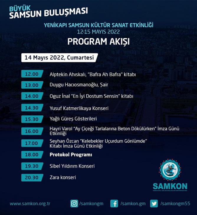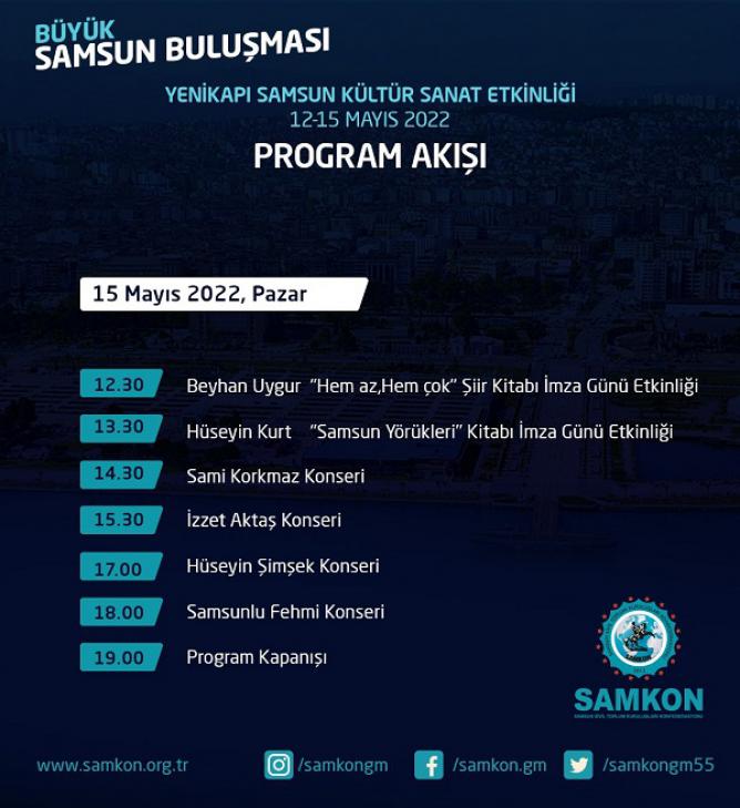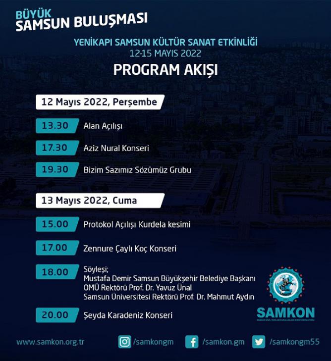 12-15 Mayıs tarihleri arasında İstanbul Yenikapı Miting Alanı’nda düzenlenen Samsun Valiliği ve Büyükşehir Belediyesi tarafından da desteklenen Samsun Tanıtım Günleri Samsun ve ilçelerini her yönüyle tanıtmak amacının yanında İstanbul ve çevre illerde yaşayan Samsunluları bir araya getirmeyi hedefliyor.