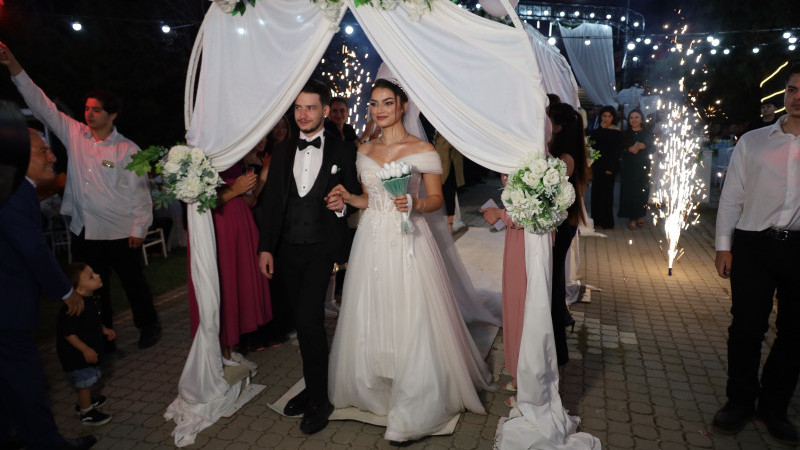 Düğün töreninde genç çift alkışlar ve meşaleler eşliğinde alana girdi. İlk danslarıyla herkesi duygulandıran çift, arkadaşları ve ailelerinin de katılımıyla gece boyunca oyunlar oynadı, halaylar çekti. Katılımcılar çifte takı takmak için uzun kuyruklar oluşturdu.